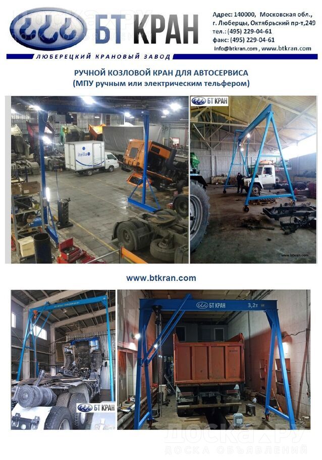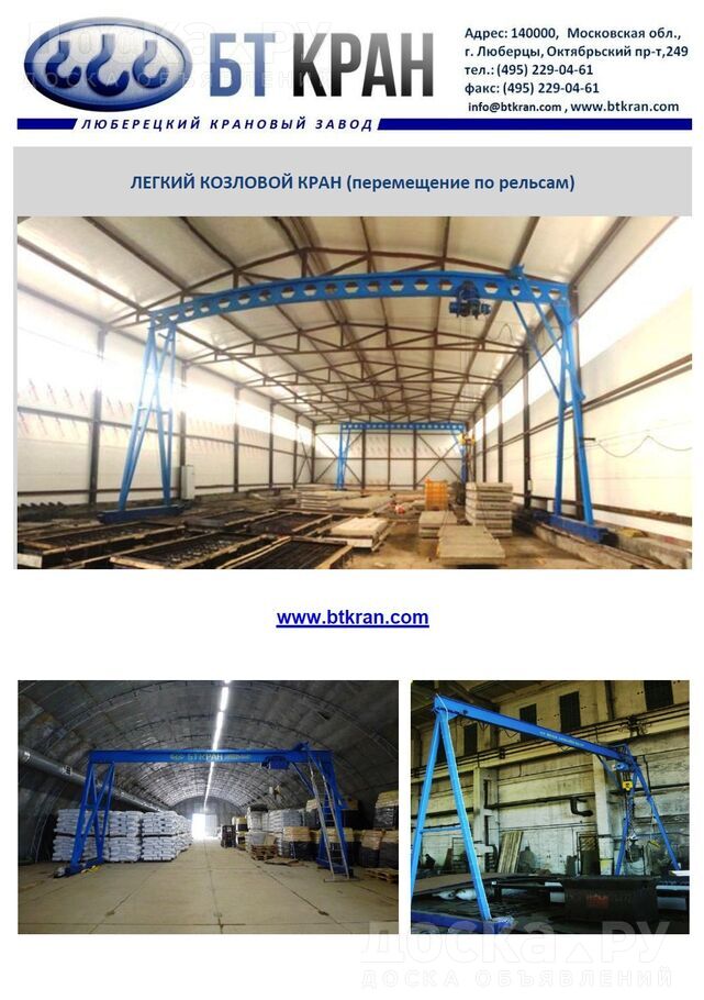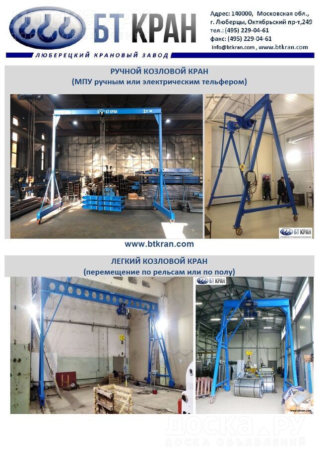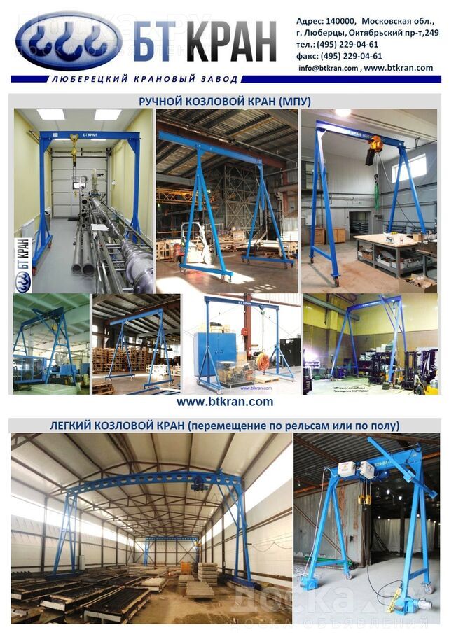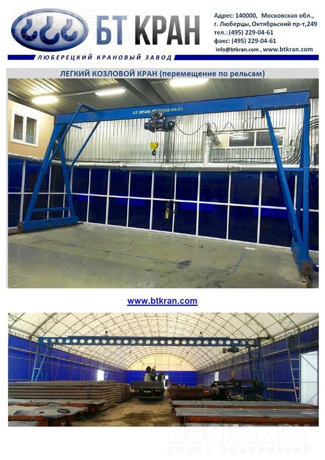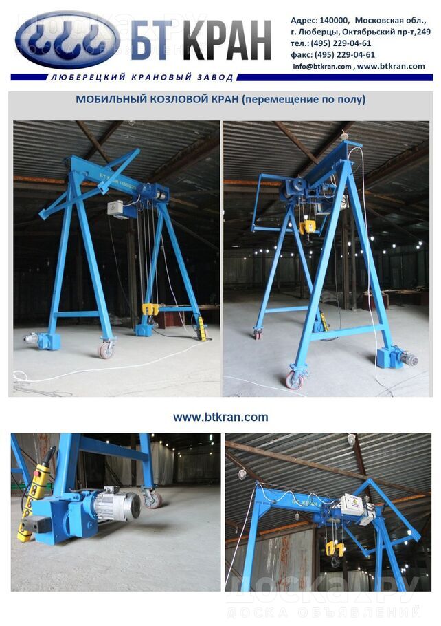 ООО БТ КРАН производит мобильные легкие козловые краны 0, 5 т, 1 т, 2 т, 3, 2 т, 5 т, 6, 3 и 10 т с ручным подъемным механизмом или электрической талью.